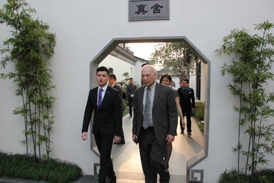 在参观过程中,他连声称赞,桃花源的建筑极为优美,各种细节都显得精致而完美,每一个门头的雕工都非常细腻。他尤其喜欢精美细致的花街铺地,在了解到桃花源的建设者香山帮国匠都是世界非物质文化遗产的传承者,他对这些艺术家深表敬意和赞叹。"桃花源把中国古典园林的艺术与现代设计风格、居住理念完美结合起来,是一个可以称之为艺术品的建筑奇观。"